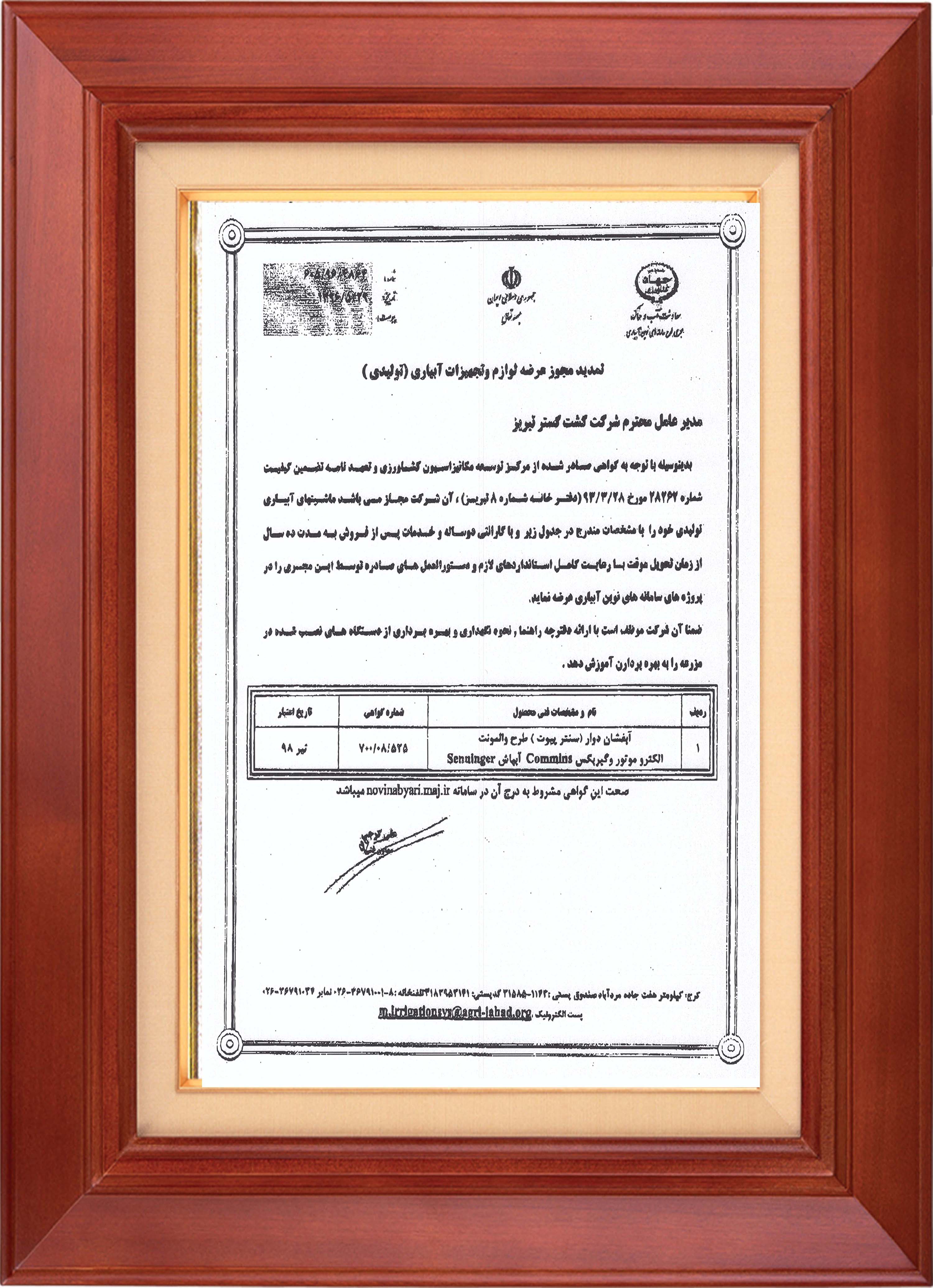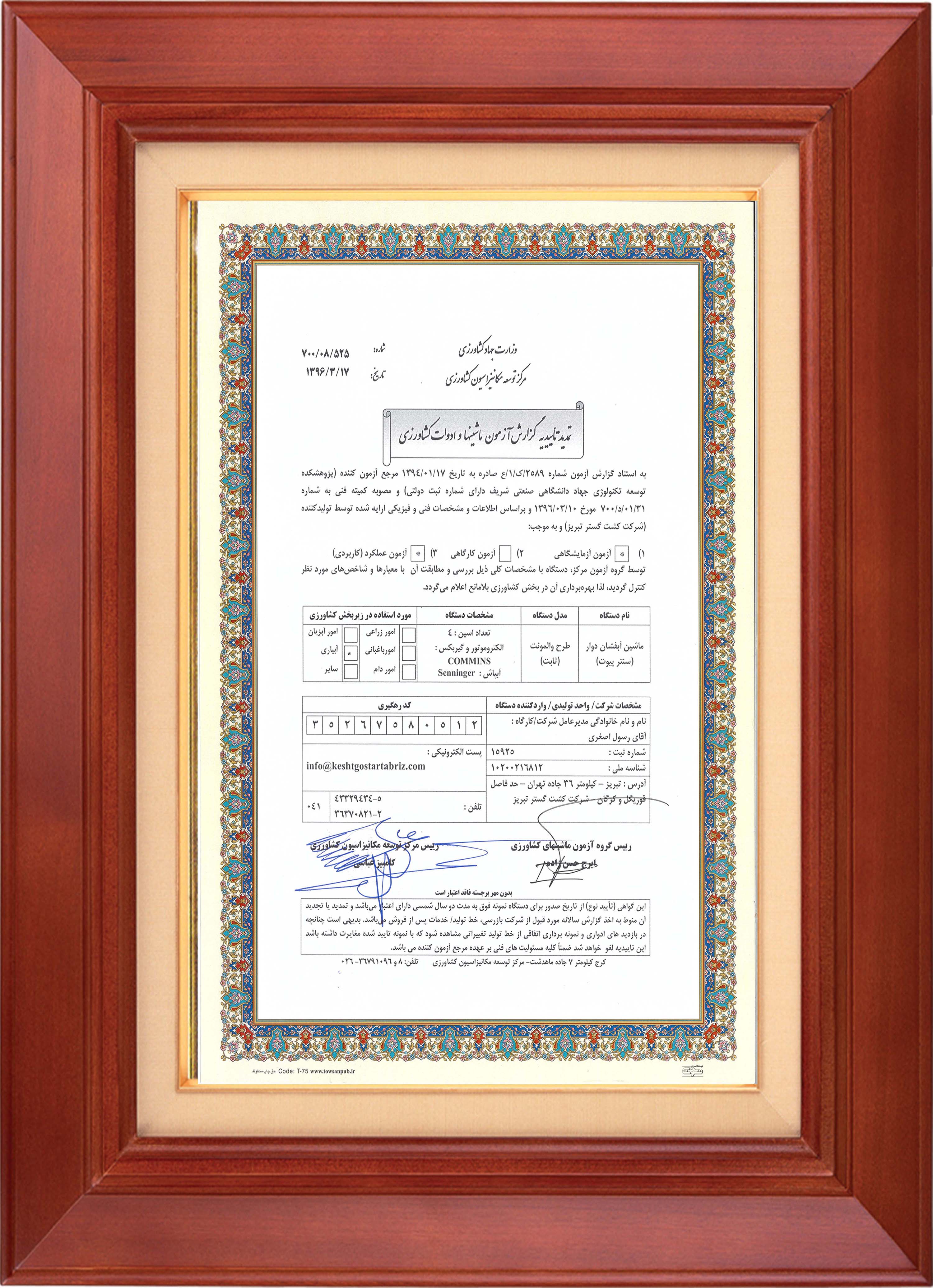 دارای تائیدیه نهائی از مرکز توسعه مکانیزاسیون معاونت آب و خاک وزارت جهاد کشاورزی و دارای مجوز عرضه دستگاه از دفتر سامانه های نوین آبیاری